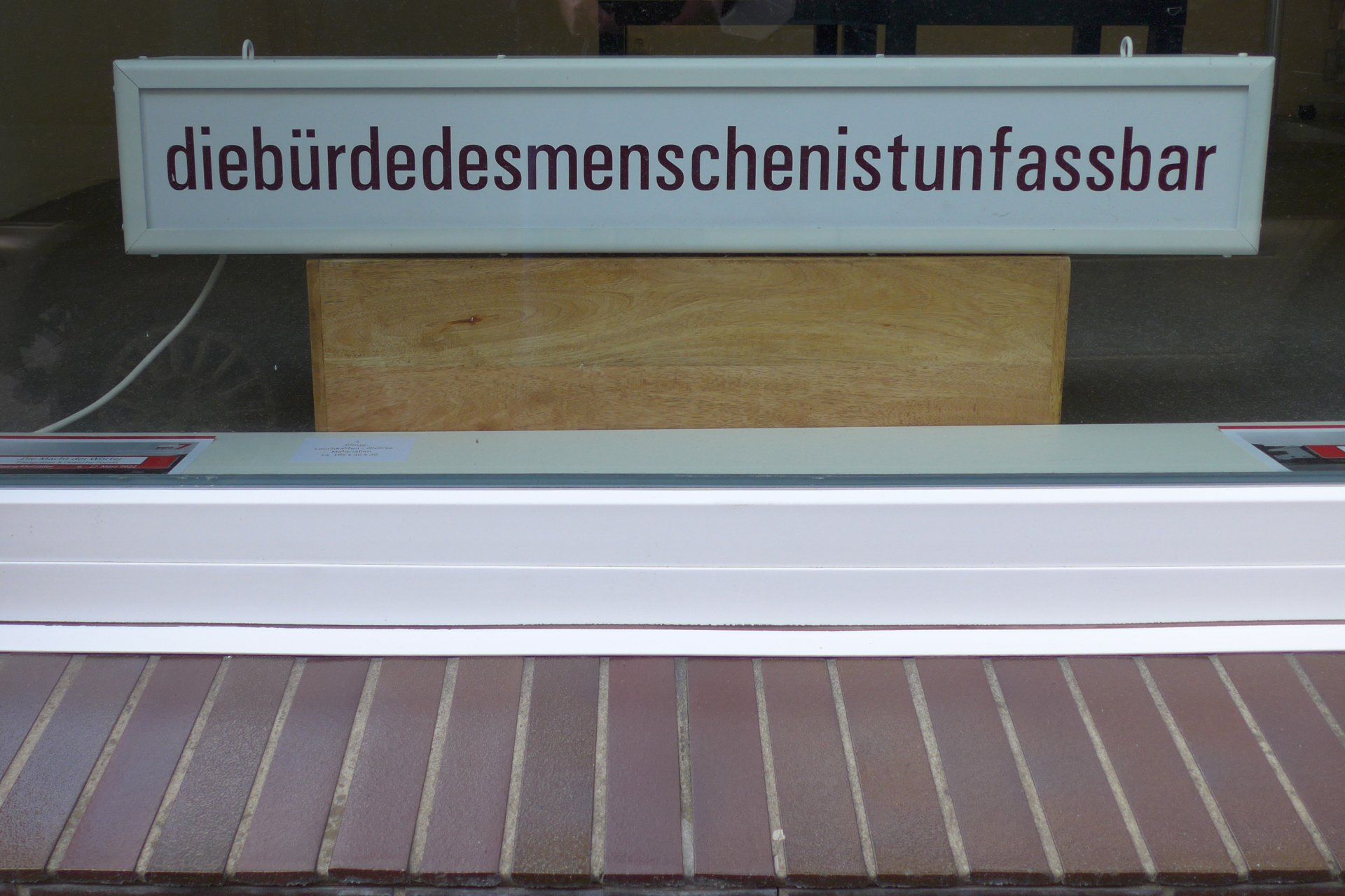 "Mit seiner lyrisch übersetzten grund-gesetzlich unantastbaren Menschenbürde kommentiert er ironisch auf Notationslinien und mit Leuchtkästen die arbeitstägliche Lebenswirklichkeit auf valentineske Weise. „Vor dem Gesetz wird niemand reich“ hinterfragt hintersinnig, aber eindrucksvoll die bundesdeutsche Lebenswirklichkeit der kleinöderschen Objekt- und Konzeptkunst mit Hilfe des Fingeralphabets, aber ganz ohne erhobenen Zeigefinger. Eine sieben-teilige Arbeit zur bundesdeutschen Realität von Anspruch und Wirklichkeit der garantierten Grundrechte."