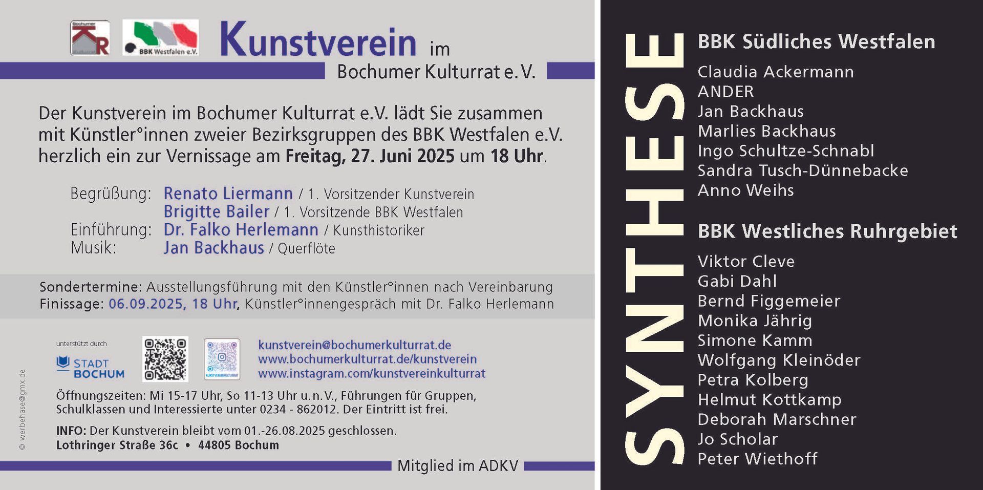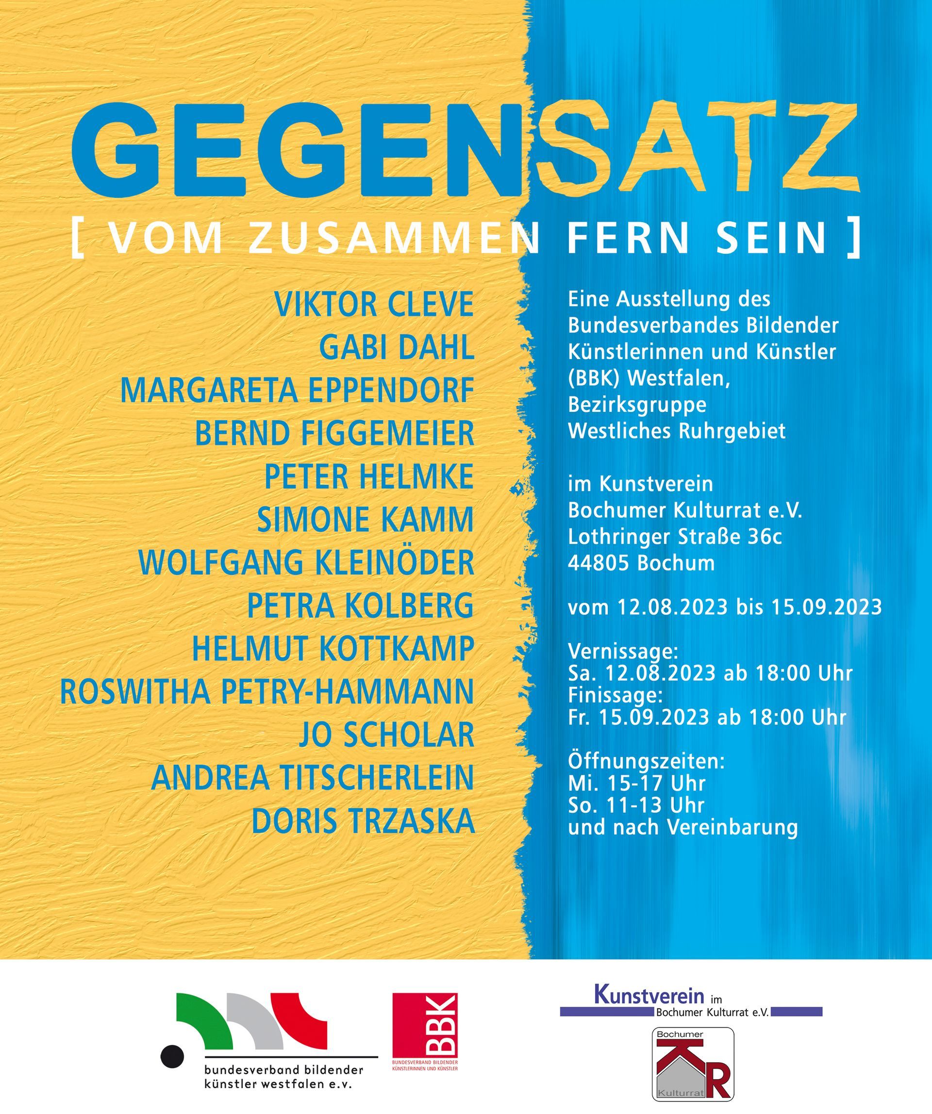 13 Künstler*innen präsentieren zu diesem Thema ihre Arbeiten in Bochum. Eröffnet wurde die Ausstellung am 12.8.23 mit der Vernissage. Renato Liermann vom Kunstverein als Gastgeber und Helmut Kottkamp als Vorstand der Bezirksgruppe Westliches Ruhrgebiet des BBK Westfalen begrüßten die Gäste in dieser tollen Location.